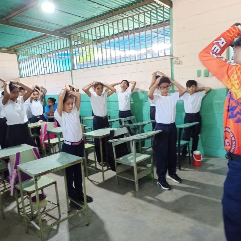 Los funcionarios hicieron énfasis en las técnicas de autoprotección esenciales, enseñando a los alumnos a identificar rutas de evacuación, zonas seguras y cómo aplicar la posición de resguardo de manera efectiva.
