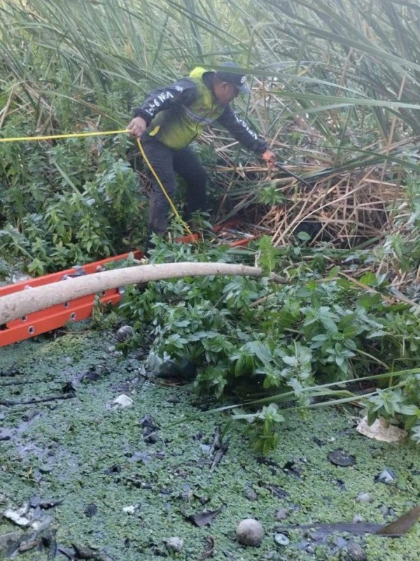 Los rescatistas fueron alertados sobre un perro que se encontraba en grave peligro de ahogamiento, atrapado en la densa maleza de una laguna local.