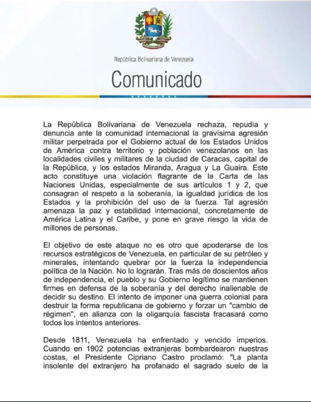La República Bolivariana de Venezuela rechaza, repudia y denuncia ante la comunidad internacional la gravísima agresión militar perpetrada por el Gobierno actual de los Estados Unidos de América contra el territorio y población venezolana en las localidades civiles y militares de la ciudad de Caracas, capital de la República, y los estados Miranda, Aragua y La Guaira.