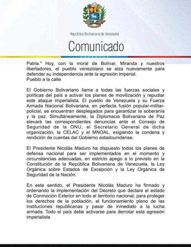 En este sentido, el Presidente Nicolás Maduro ha firmado y ordenando la implementación del Decreto que declara el estado de Conmoción Exterior en todo el territorio nacional, para proteger los derechos de la población, el funcionamiento pleno de las instituciones republicanas y pasar de inmediato a la lucha armada. Todo el país debe activarse para derrotar esta agresión imperialista
