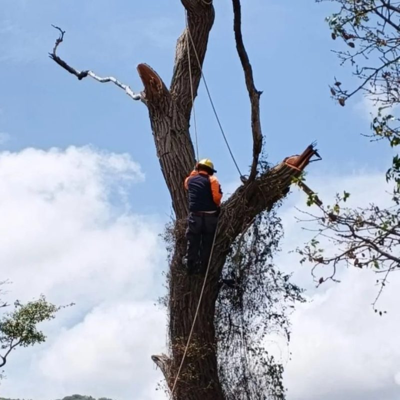 La intervención consistió en la tala controlada del ejemplar; empleando equipos de corte de alta potencia (motosierras) y aplicando estrictos protocolos de seguridad, permitiendo que el proceso de desmembramiento del árbol se realizara de manera efectiva.